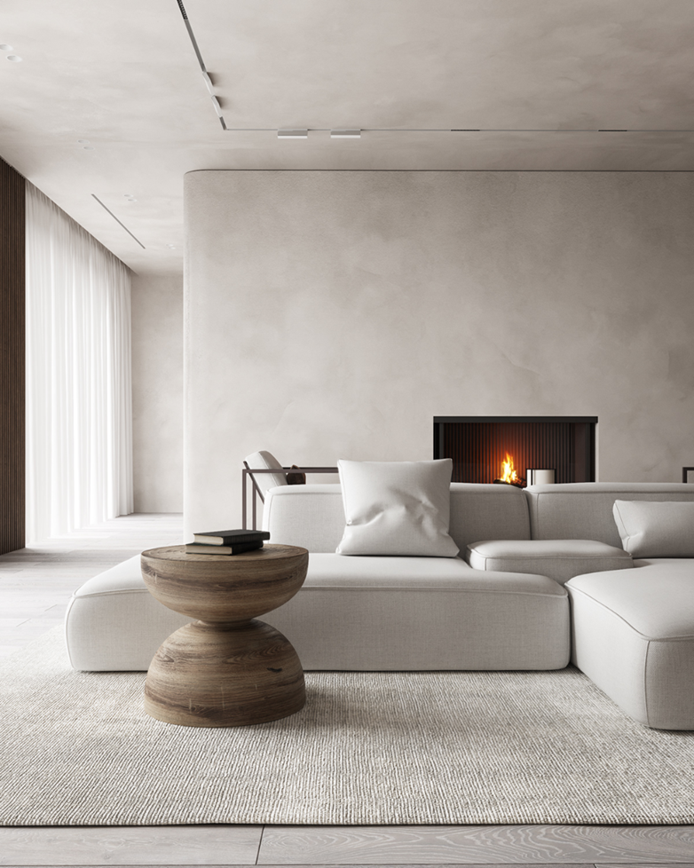 侘寂風的裝潢主要以中性色為主,呈現黯淡寂靜的氛圍,通常也會有粗糙手工的質感,像水泥、藝術塗料等,保存著人類原始建造建築的樣貌。而談及「原始」當然也要有大自然元素,富有歲月感的枯木、沙土、磨石提取大地色,用這些相對飽和溫暖的顏色平衡低沉暗色系,讓空間看起來更輕盈自在。