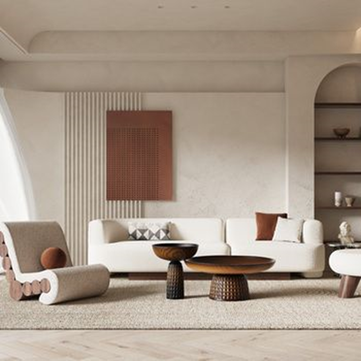 因為牆面的留白及樸實的色彩,讓家具變成了主角,加上不使用過多色彩的特性,選用不過度加工、保有本來色彩的亞麻、藤編等材質製成的家具,或想融入其他風格,講求設計感,也能放置具有俐落線條的暖光燈具來點綴些柔和的氣息;而放置的位置也很重要,因追求原始貼近自然,會讓家具像是原本就在那裡或從某處長出來似的,將家具融合到環境當中,把座椅從牆壁延伸、浴缸直接從地上延伸出來等等,彷彿一切都是那麼地自然。